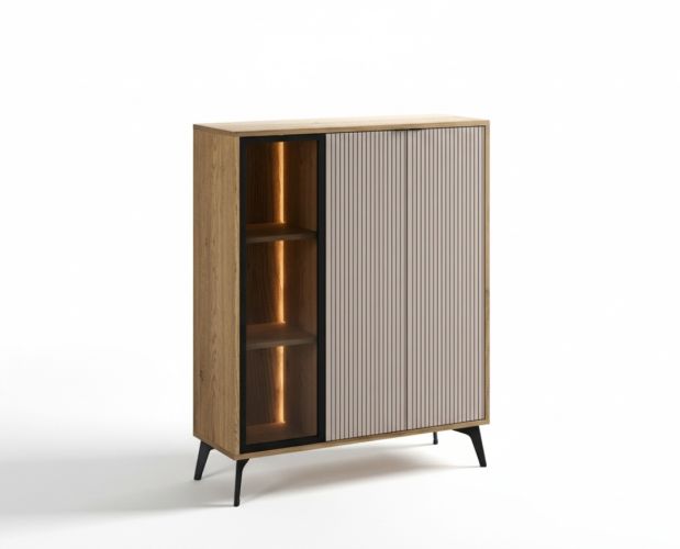 Ниска витрина Lina представлява комбинация от модерен дизайн и функционалност . Оригиналният декор ще направи хола по-топъл и елегантен, лесно се вписва в жилищни помещения с различни размери.